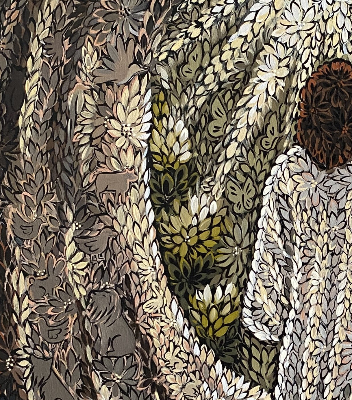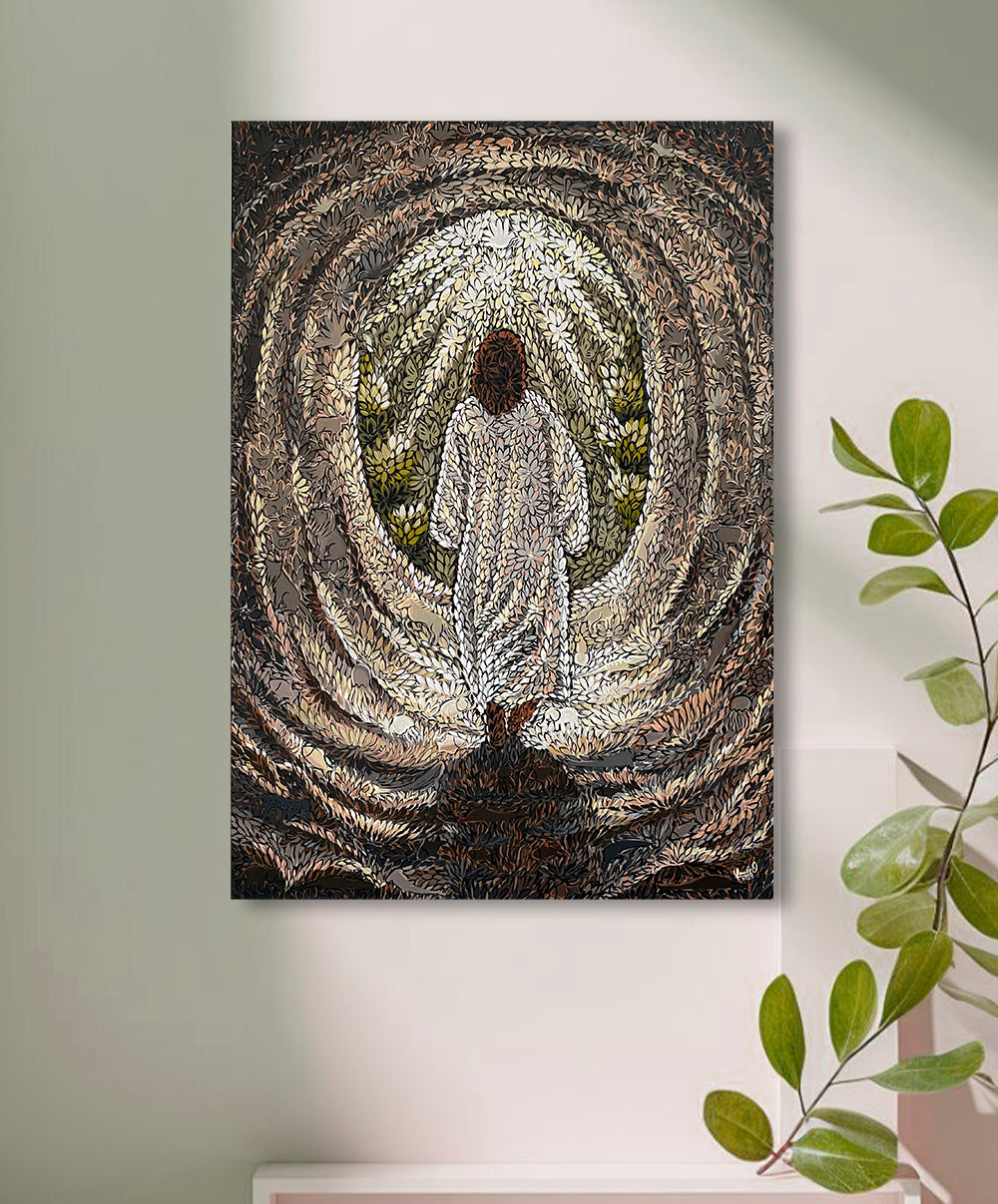 Esta obra contiene una representación de Jesús Resucitado, está formada con pequeñas flores, hojas y figuras de aves, animales marinos y terrestres, que se pueden apreciar al mirarla de cerca.
