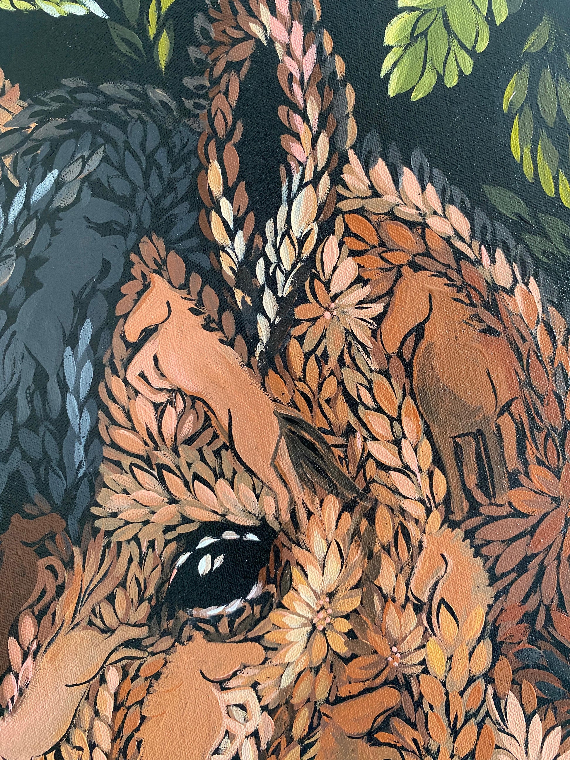 Esta pintura contiene una escena en la que un caballo se asoma entre las hojas de un jardín y se encuentra en él: colibríes y mariposas. En las figuras pequeñas que conforman la imagen, podemos ver caballos, hojas, flores y algunos insectos entre las hojas.